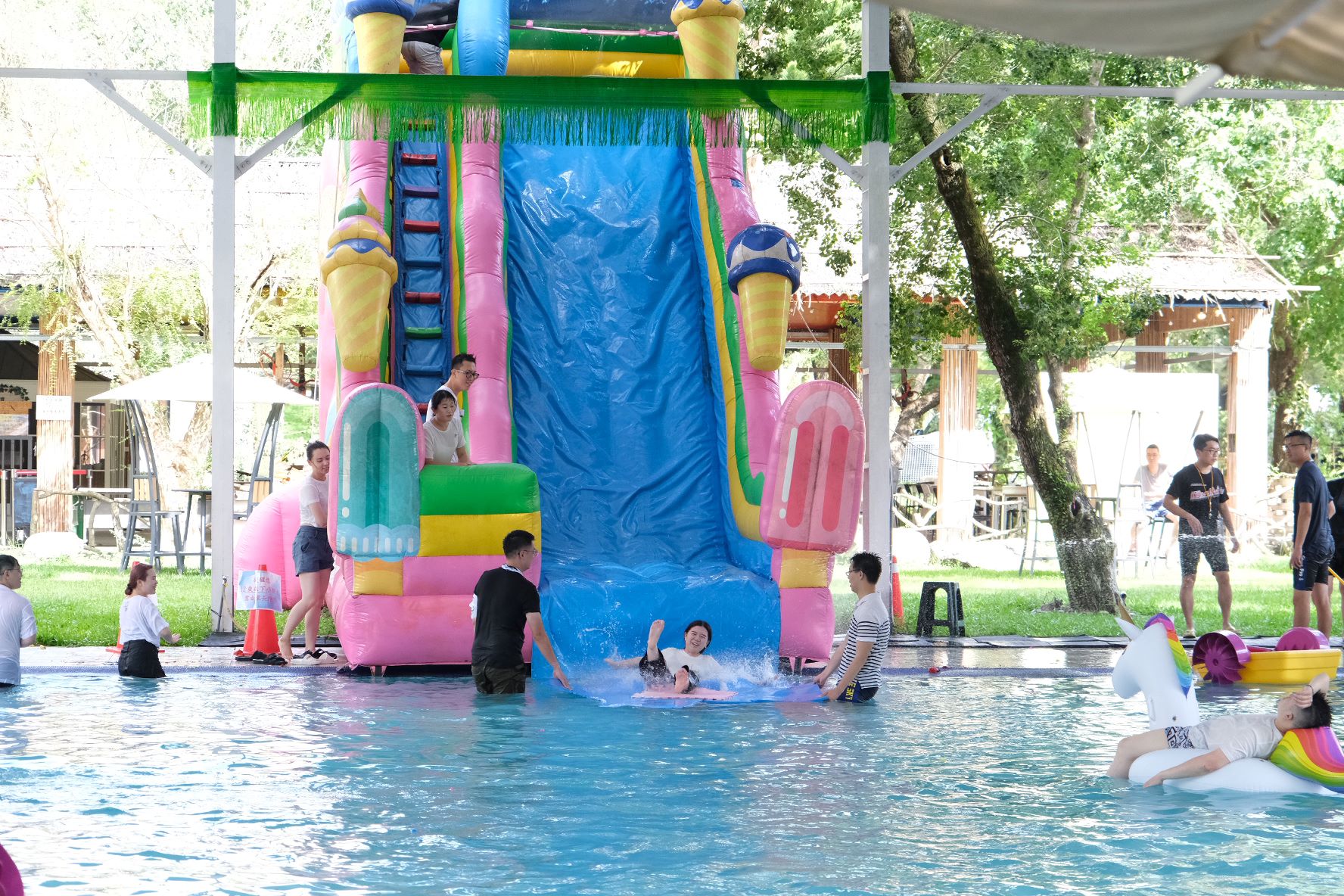 配上好玩又刺激的充氣滑水道,戲水池上方附有遮陽網不怕曬太陽,來到營區絕不能錯過啦!
